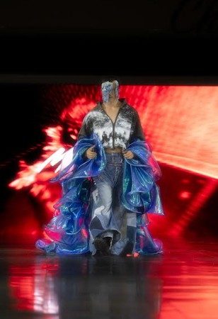 En pasarela, la propuesta destacó por siluetas futuristas y experimentales, con abrigos de
